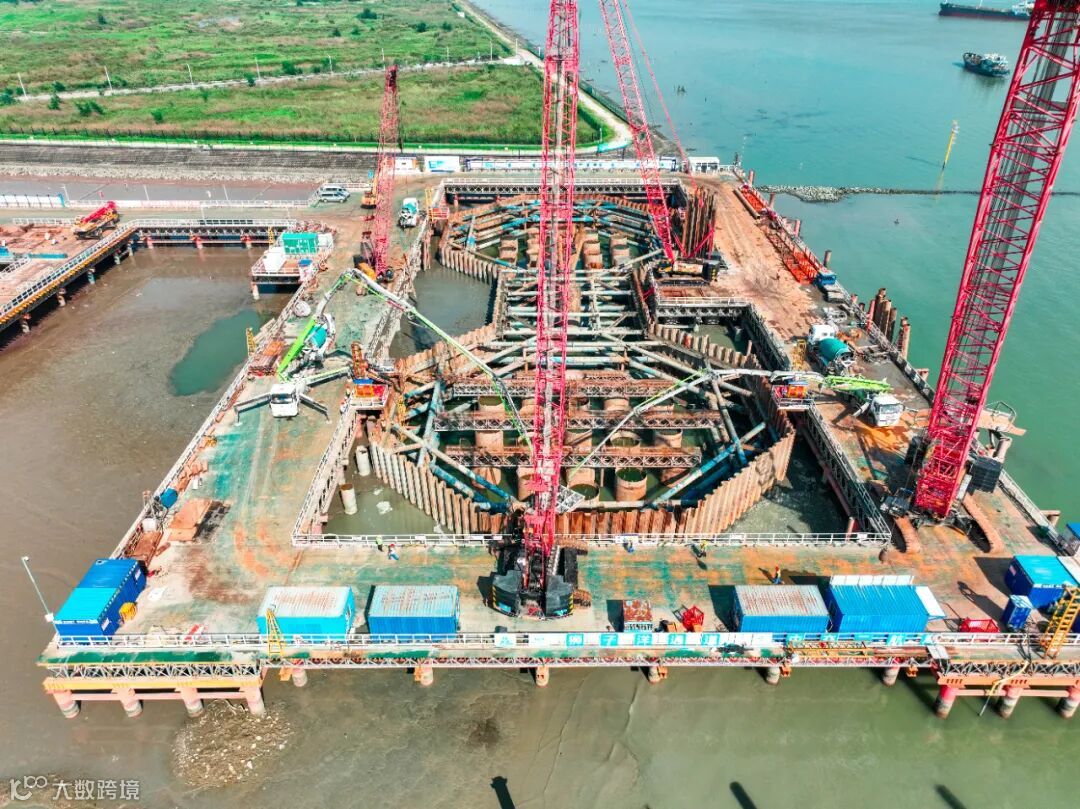 直径40米,承台施工基坑支护采用钢板桩围堰结构形式,将深插河床70米的桩基与高342米塔柱连接在一起,是大桥重要的受力结构之一。