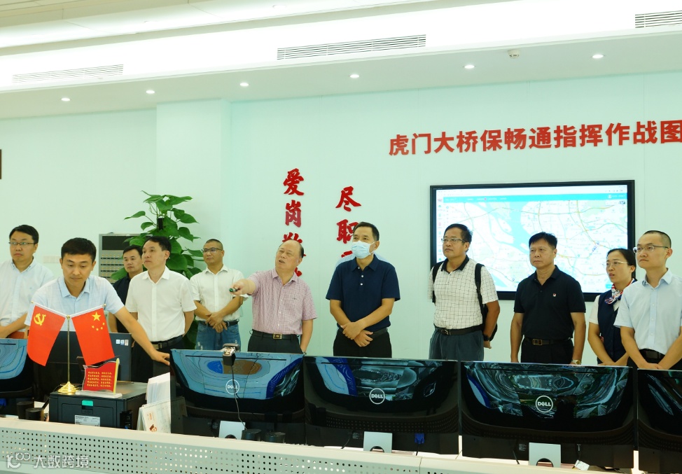 在虎门大桥监控中心,王康臣一行通过重点桥梁健康检测系统,详细了解虎门大桥悬索桥和辅航道桥实时监测情况,并查看了路面、收费站、