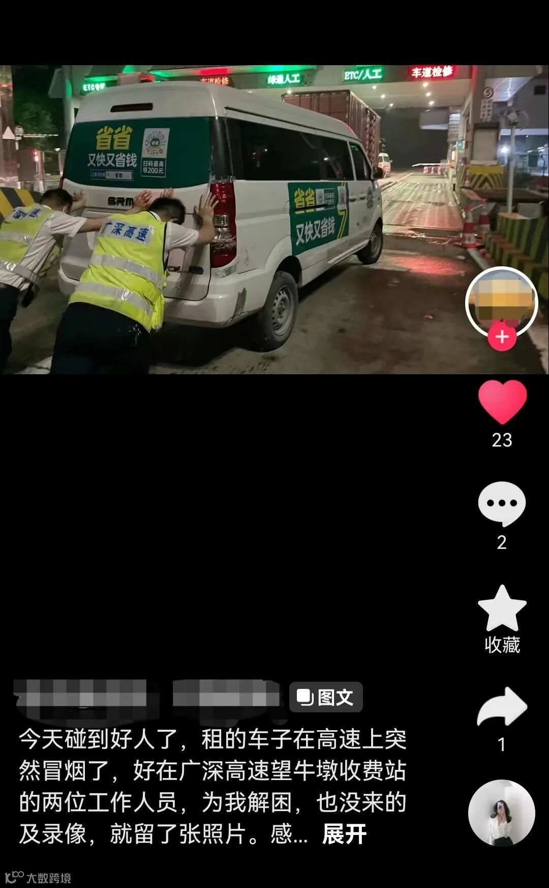 视频上写着:“今天碰到好人了,租来的车子在高速上突然冒烟了,好在广深高速望牛墩站的两名工作人员为我解困。”得知被公开表扬,彭李宏有些意外:“以后要尽自己力量多帮助司乘,提供更周到的服务。”