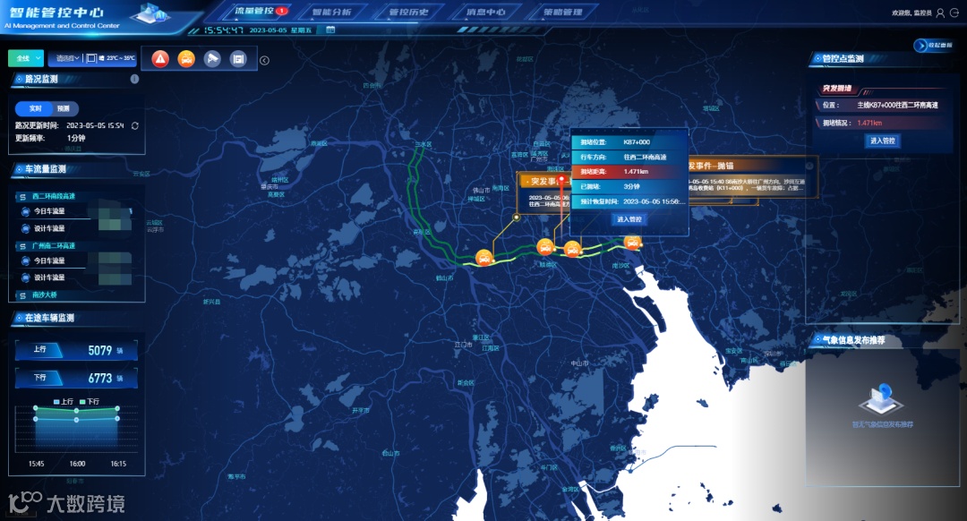 五一前夕,由南环段分公司与利通科技智能交通研究院合作开发的“智能管控中心”系统正式在南沙大桥投入使用。该系统对路运一体化平台进行整合,分析高速公路交通流量和事件信息,预测短时交通变化趋势,智能推送对应的管控策略及措施,构建“感知-预知-管控-