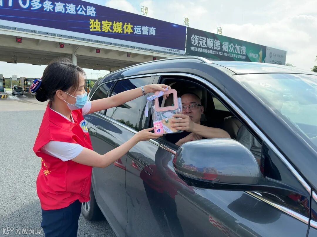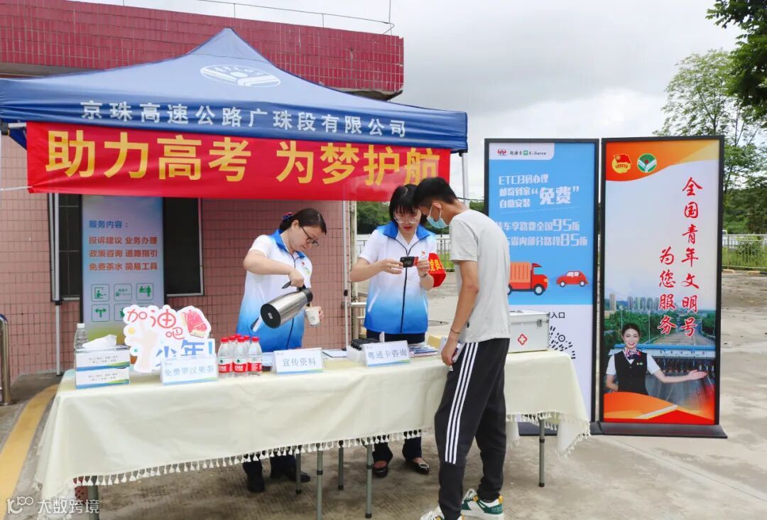 “你好,这是我们的爱心助考包,里面有文具、风油精等用品,祝你考试顺利!”6月7日上午,考生小张和家人驾车行经广深高速福永站点时,接过志愿者送上的助考物资。