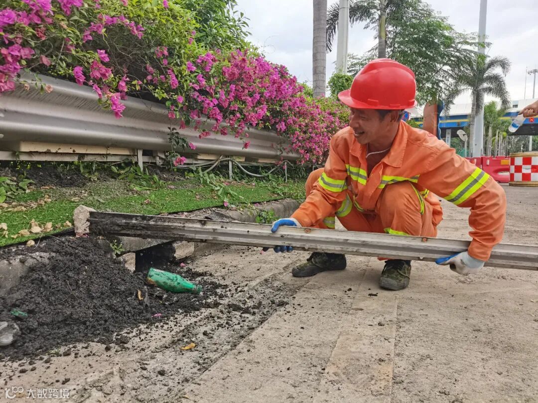 南环段高速工作人员排查、加固收费广场标志标牌、铁栏栅、水马、交通锥等附属设施进行