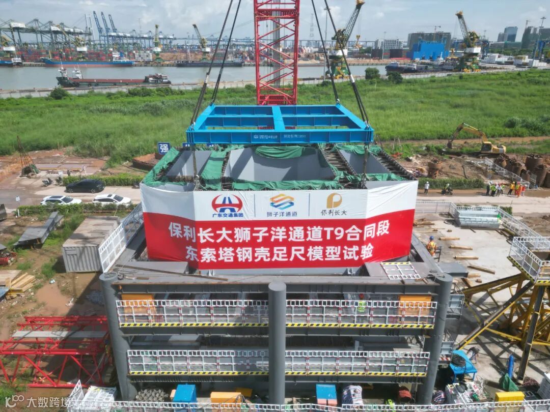 本次足尺试验分为上下两节段钢壳,钢壳填充采用低热水泥拌制的C80专用混凝土,现场已完成底节段混凝土浇筑与顶节段钢壳安装调位,现阶段工作验证了C80专用混凝土工作性能、钢壳加工制造精度以及钢壳安装调位工艺,试验数据验证了设计单位、科研单位前期的相关计算分析。