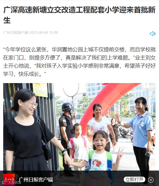 9月4日,新塘项目建设迎来新进展,该项目重要组成部分华润置地公园上城配套小学——广东外语外贸大学新塘实验小学如期开学。小学一年级招6个班,约240名学生。校园里,老师和工作人员笑着迎接每一位新生。