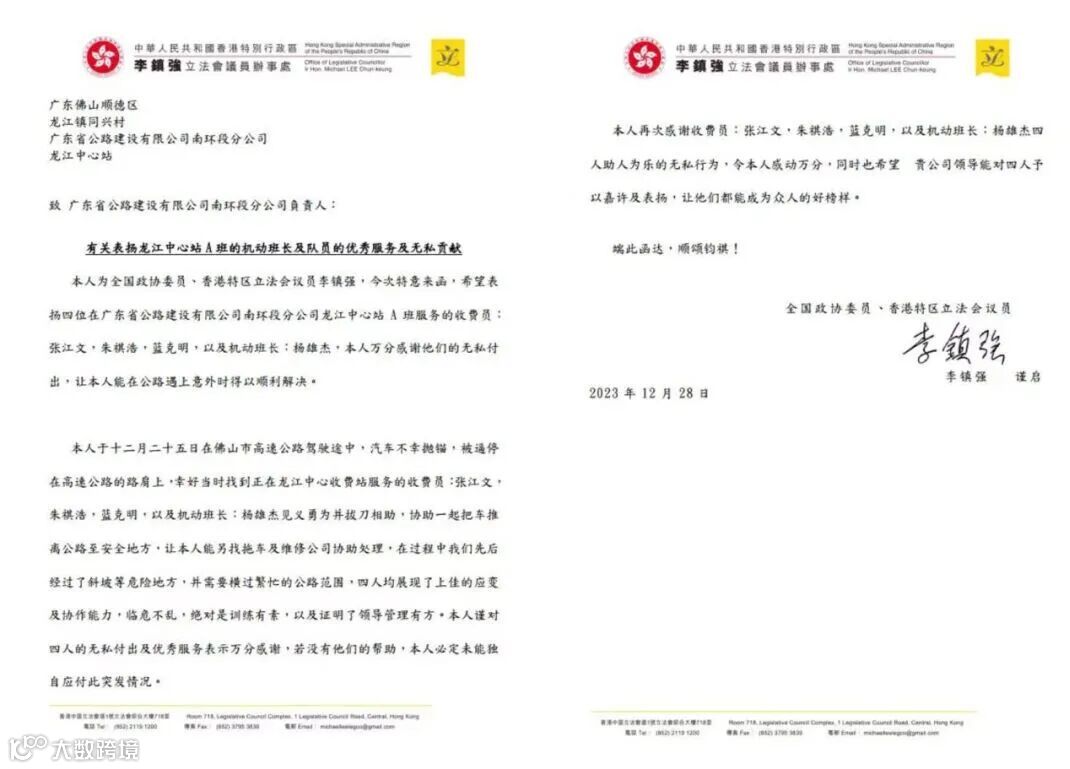 的感谢信。香港特别行政区全国政协委员、立法会议员李镇强先生在信中写道,“杨雄杰、张江文、朱祺浩和蓝克明等四人见义勇为,均展现出上佳的应变及协助能力,让我能在高速公路上遇到意外时得以顺利解决。”字句情真意切,对参与救助的龙江站工作人员表示衷心的感谢。