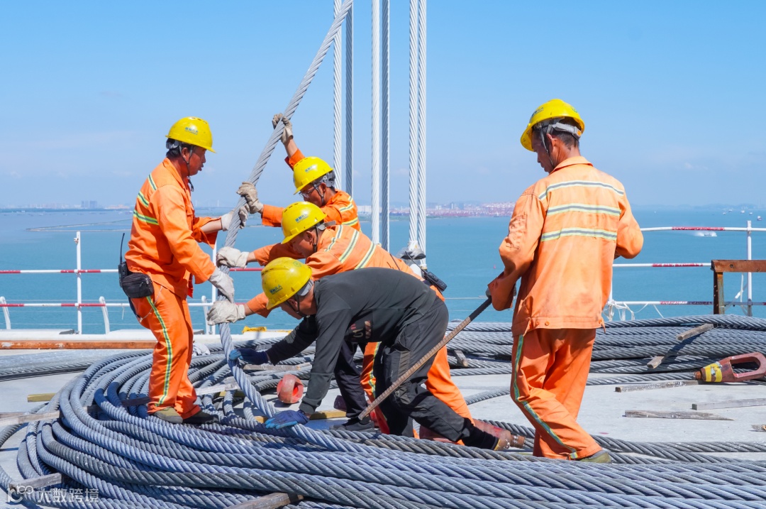 伶仃洋大桥建设者正在盘卷最后一根猫道承重绳
