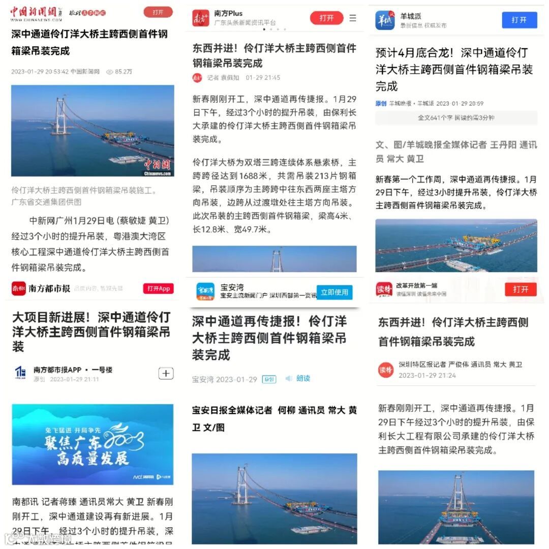 深中通道伶仃洋大桥于1月12日完成东主跨首片钢箱梁的架设施工,计划今年实现大桥合龙。今年春节期间,近百名建设者坚守岗位,有序推进大桥钢箱梁吊装工作,保证项目建设进度。