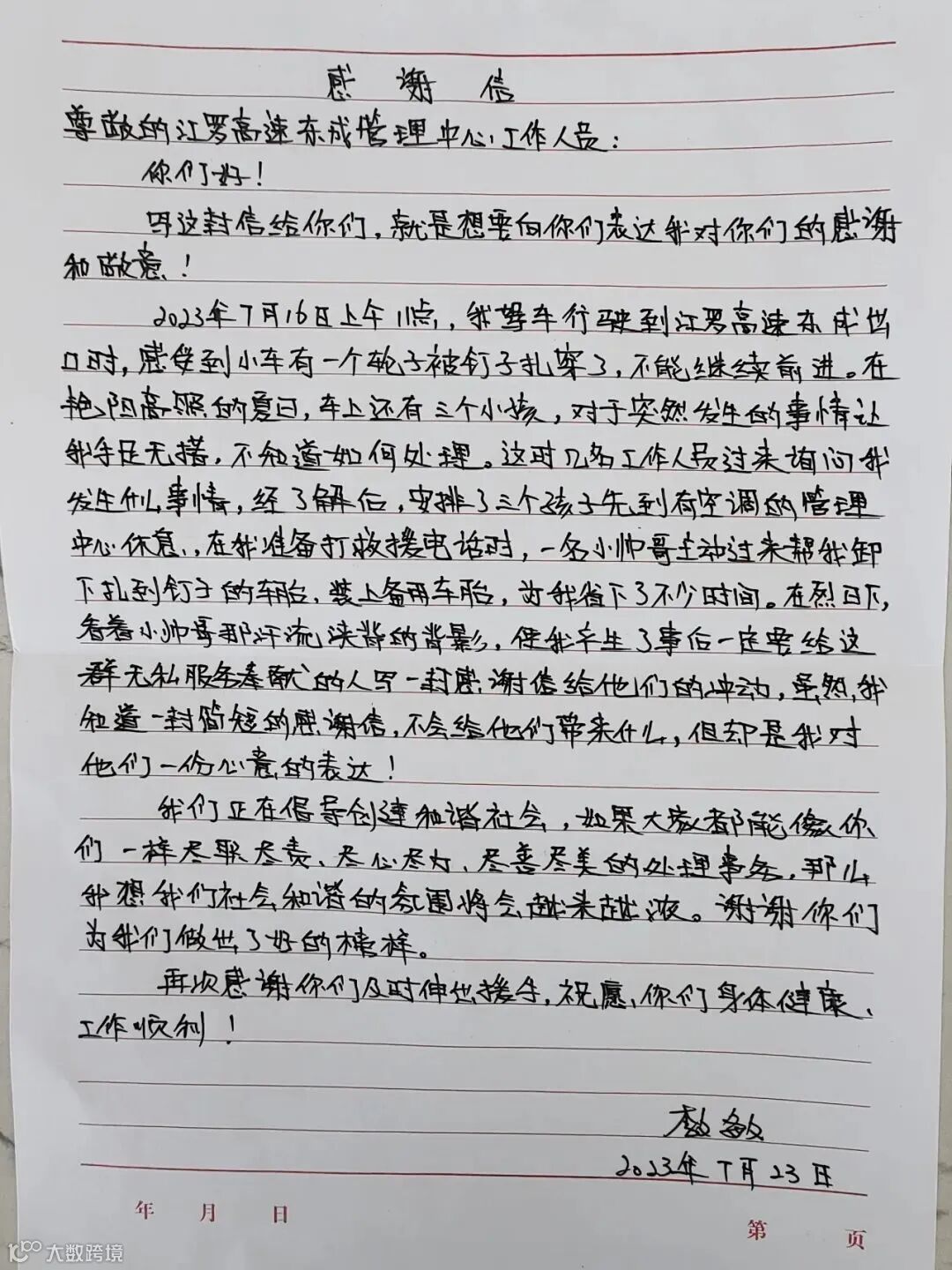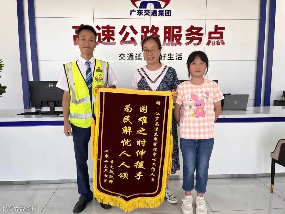 8月3日,李女士带着女儿将一面印有“困难之时伸援手,为民解忧人人颂”的锦旗和一封感谢信,送到江罗高速东成站工作人员手中。