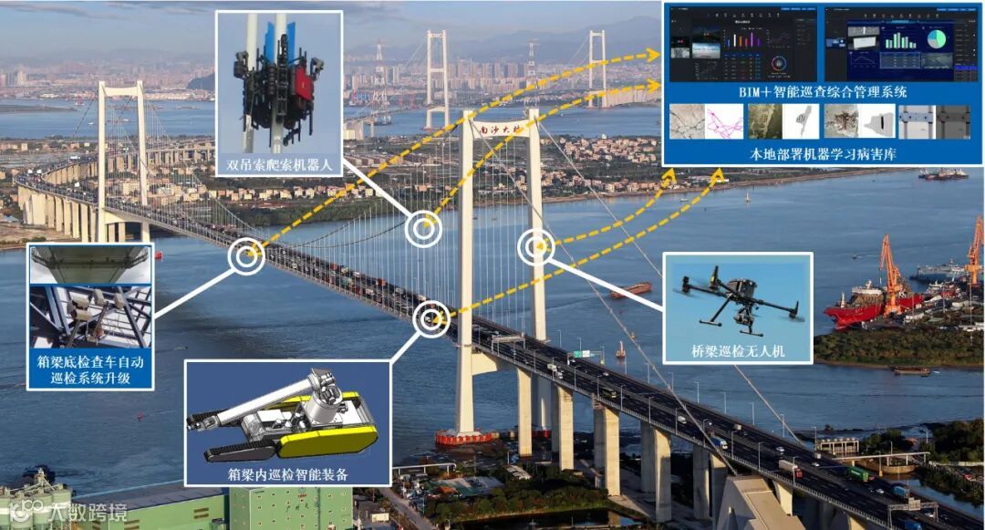 南沙大桥在管养、维护和应急处置上也走出了特色路,逐渐建立起“分项养护、总体评估”的专业化养护体系,突破车辆荷载识别、约束关键装置、钢箱梁疲劳、涂层耐久性、智能巡检、长吊索异常振动、索夹螺杆力在线监测等多个关键核心技术,逐步形成养护工程和科技研发双引擎驱动、产学研用深度融合的体制机制,助力养护科学决策,不断提升桥梁养护的专业化、智慧化和信息化水平。