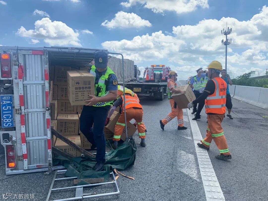 10时44分,交警、拯救、养护人员到场。为帮助货车司机挽回损失,现场工作人员顶着近40度的高温,合力将散落灯具搬运至路肩。10时58分,货车被扶正拖离,2.5吨灯具被转移至黄阁站,现场交通恢复正常。