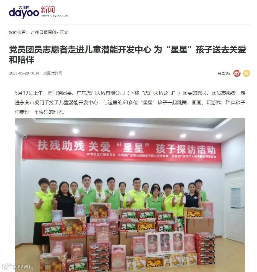 5月19日,公司团委、虎门镇团委和虎门大桥公司团委组织18名青年志愿者,走进虎门手拉手儿童潜能开发中心,开展“关爱星星的孩子 点亮无限可能”为主题的关爱自闭症儿童志愿