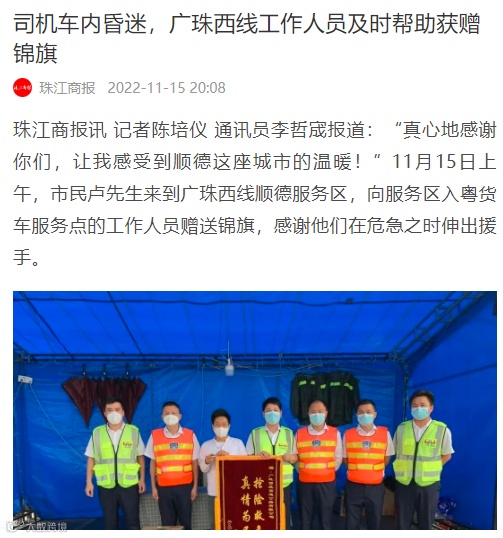 交通人故事 | 救治及时!广珠西线高速入粤货车服务点收到锦旗