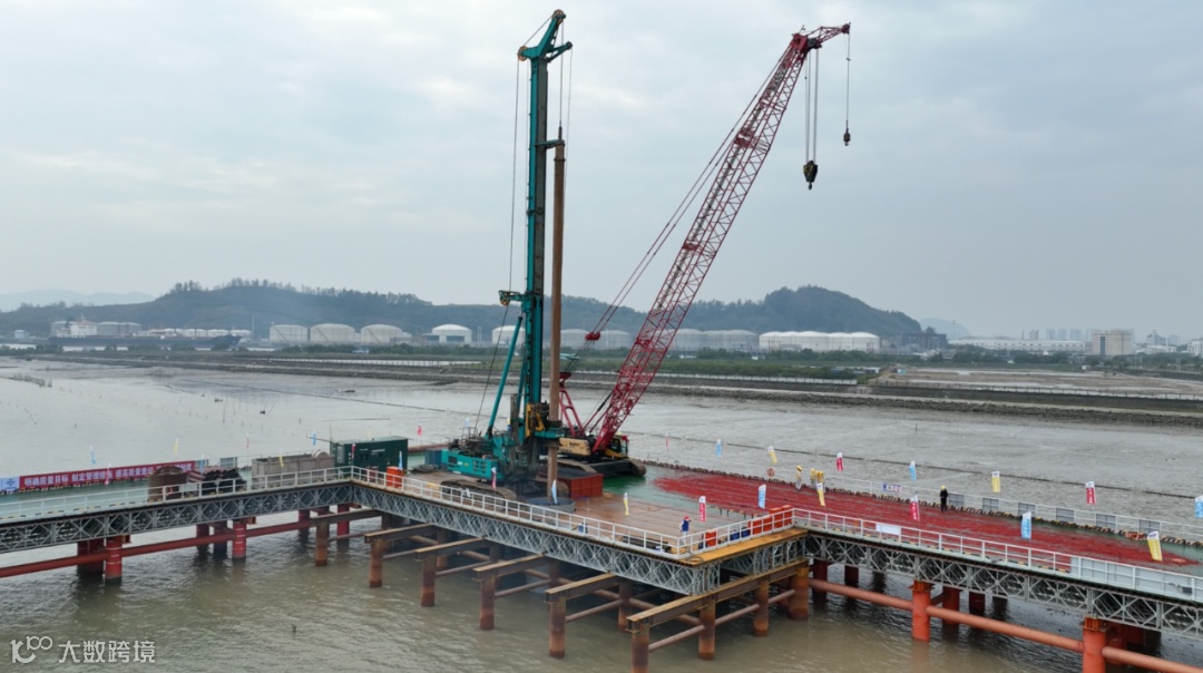 目前,狮子洋通道先行工程已完成施工平台建设,正进行主塔首桩及锚锭施工。