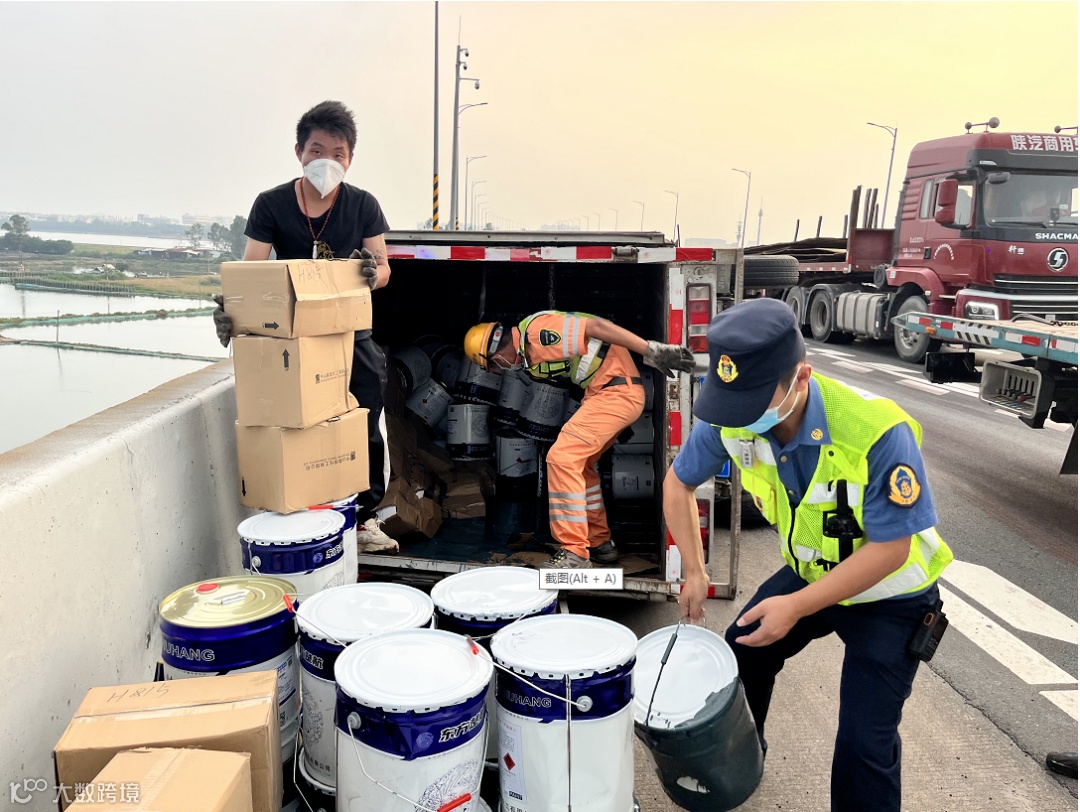 小货车侧翻,广珠段路政员快速转运70桶油漆