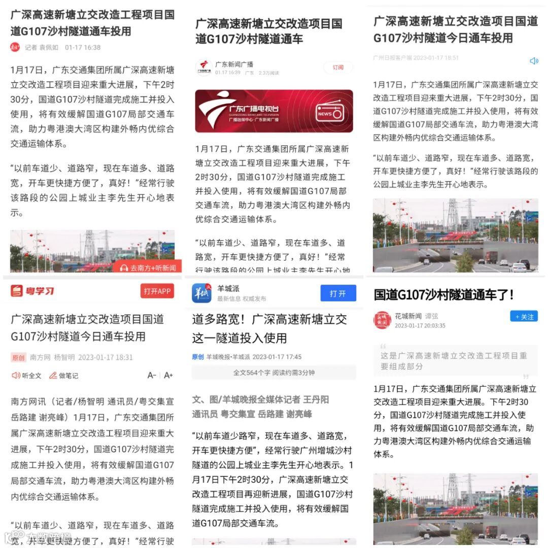 1月17日,广深高速新塘立交改造工程项目(以下简称“新塘项目”)迎来重大进展。国道G107沙村隧道完成施工并投入使用,将有效缓解国道G107局部交通车流,助力粤港澳大湾区构建外畅内优的综合交通运输体系。