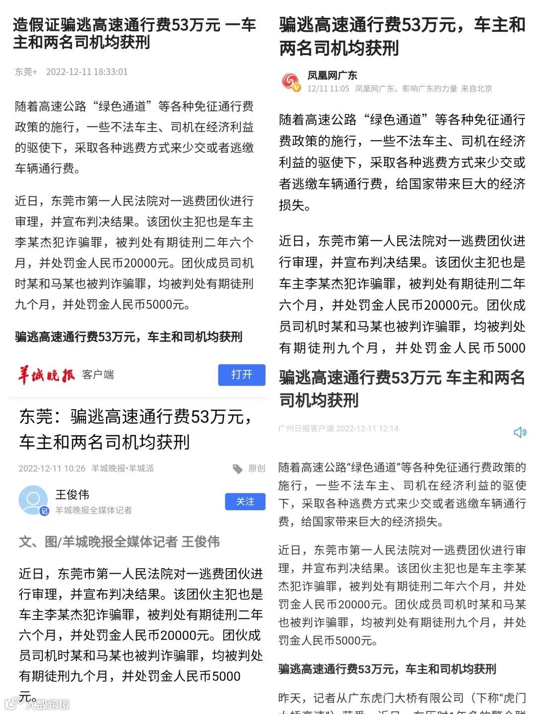 2020年底,虎门大桥公司数据稽查组在对免费绿通车进行常规筛查时,发现多台“鲁H”牌重型牵引车的行驶证有假冒证件的嫌疑。稽查组通过查找相关车辆的通行记录,利用大数据24小时跟踪相关车辆的行驶动态,对车辆的行驶轨迹和停靠惯性进行筛查,并根据相关车辆的图片及录像等进行人工稽查,最终查实相关涉嫌逃费的车辆、车主及司机的相关信息。2020年12月,虎门大桥公司经与交管部门进一步核实,确定相关车辆涉嫌利用假证假冒绿色通道车辆进行逃费的违法行为。