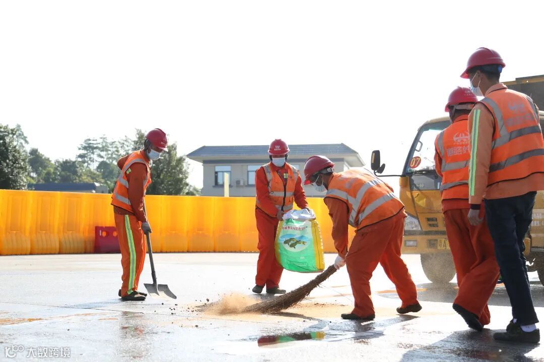 由粤运拯救、能达养护组成的清障组进入现场进行收尾工作。粤运拯救对“事故”车辆实施拖离作业,养护人员完成“事故”现场路面清理工作。