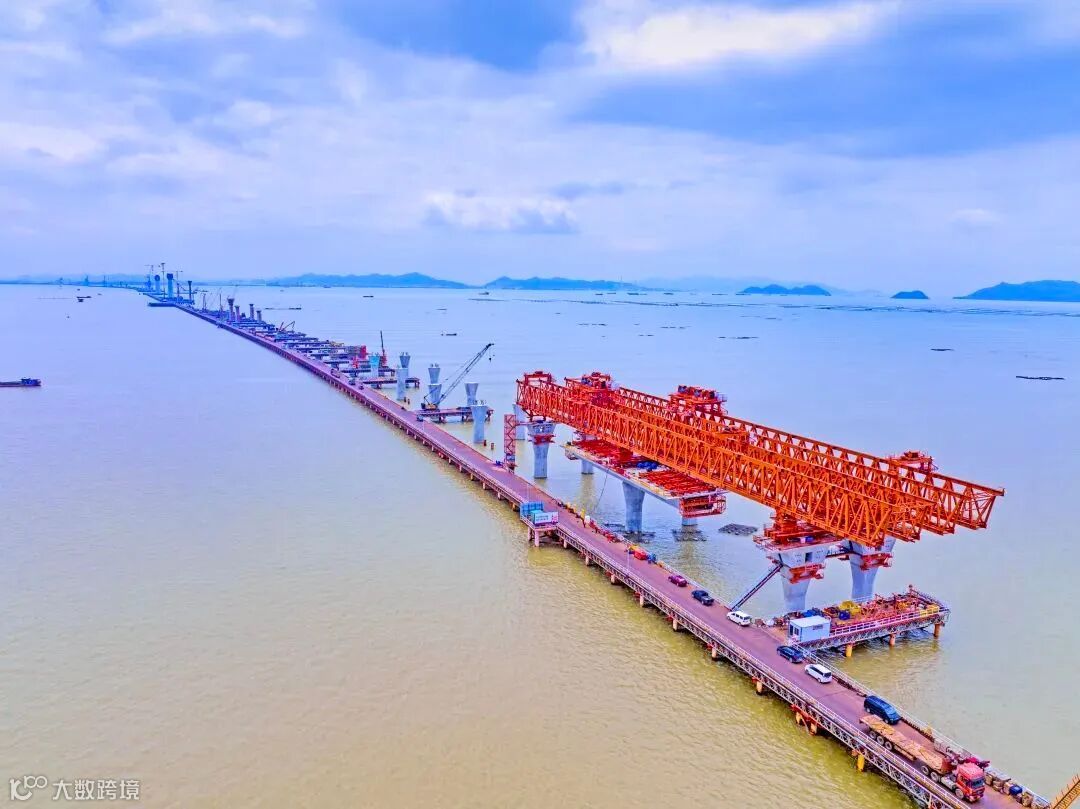 今年5月7日: 继东引桥首跨节段梁成功合龙之后,项目顺利完成千吨架桥机首次过孔施工。千吨架桥机漫步高空,犹如蛟龙出海,在黄茅海上空正式开启搭积木模式,为东引桥陆地和海上节段梁的架设打下了坚实基础。