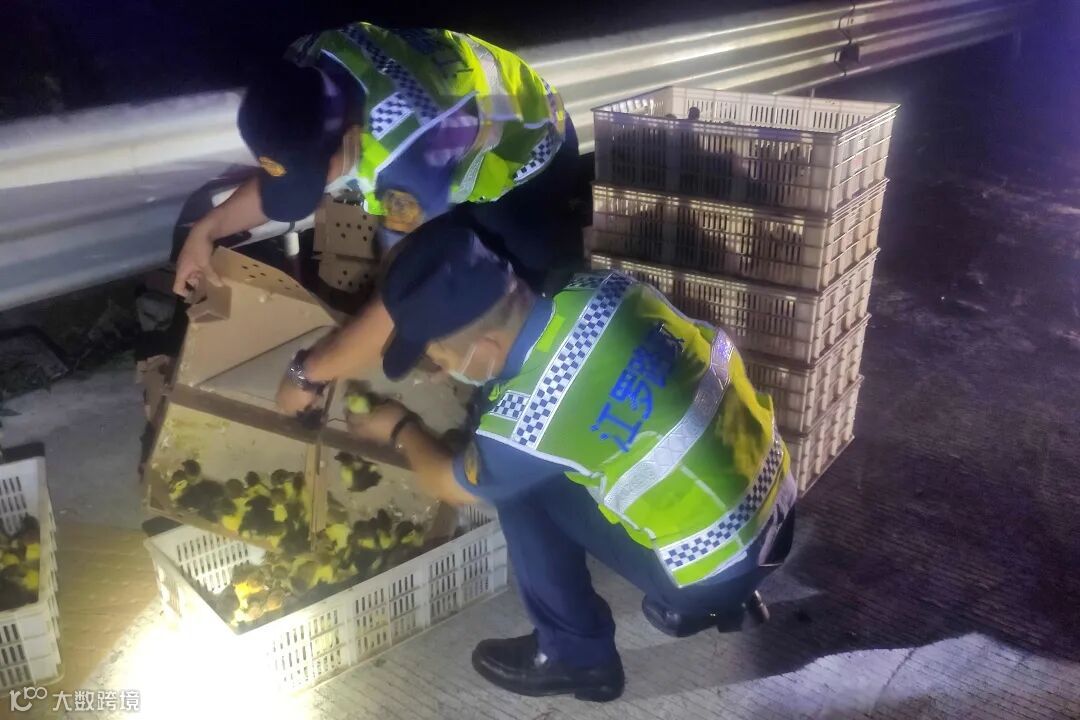 方向)发生货车碰撞事故。接报后,路政二中队副中队长陈万东与路政员萧明剑、徐登堂立即赶赴现场。到场后,路政员发现事故车旁有大量小鸭子在慢车道及护栏外转悠。据了解,该货车运载了8000只小鸭子前往开平市,途中因爆胎导致车辆碰撞护栏,大量小鸭子掉到路面上。在确认司机没有大碍后,路政员与赶来的拯救、养护人员,一方面封闭事故车道,疏导现场交通;另一方面打着手电筒,到护栏外的树丛寻找走丢的小鸭子,尽全力减少司机损失。21时45分,大部分小鸭子被重新装载到转运车,现场交通恢复正常。