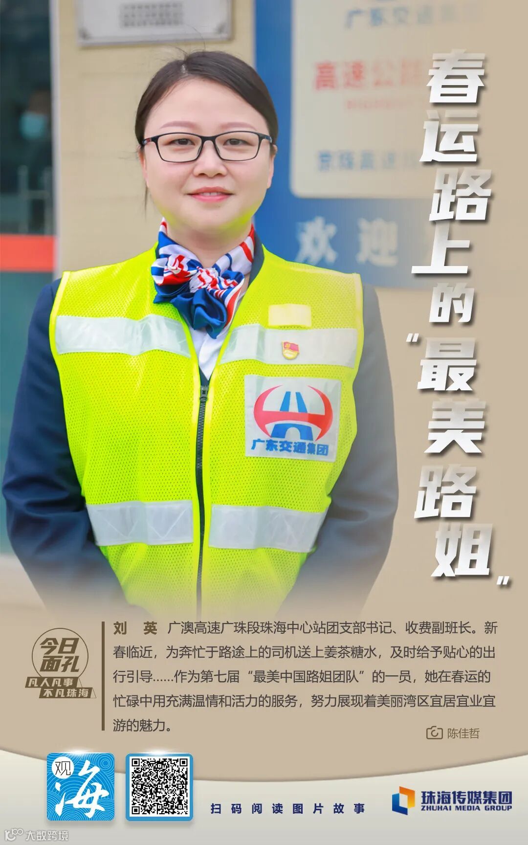 刘英,广澳高速广珠段珠海中心站团支部书记、收费副班长。新春临近,她为奔忙于路途上的司机送上姜茶糖水,及时给予贴心的出行引导……作为第七届“最美中国路姐团队”的一员,她在春运的忙碌中用充满温情和活力的服务,努力展现着美丽湾区宜居宜业宜游的魅力。