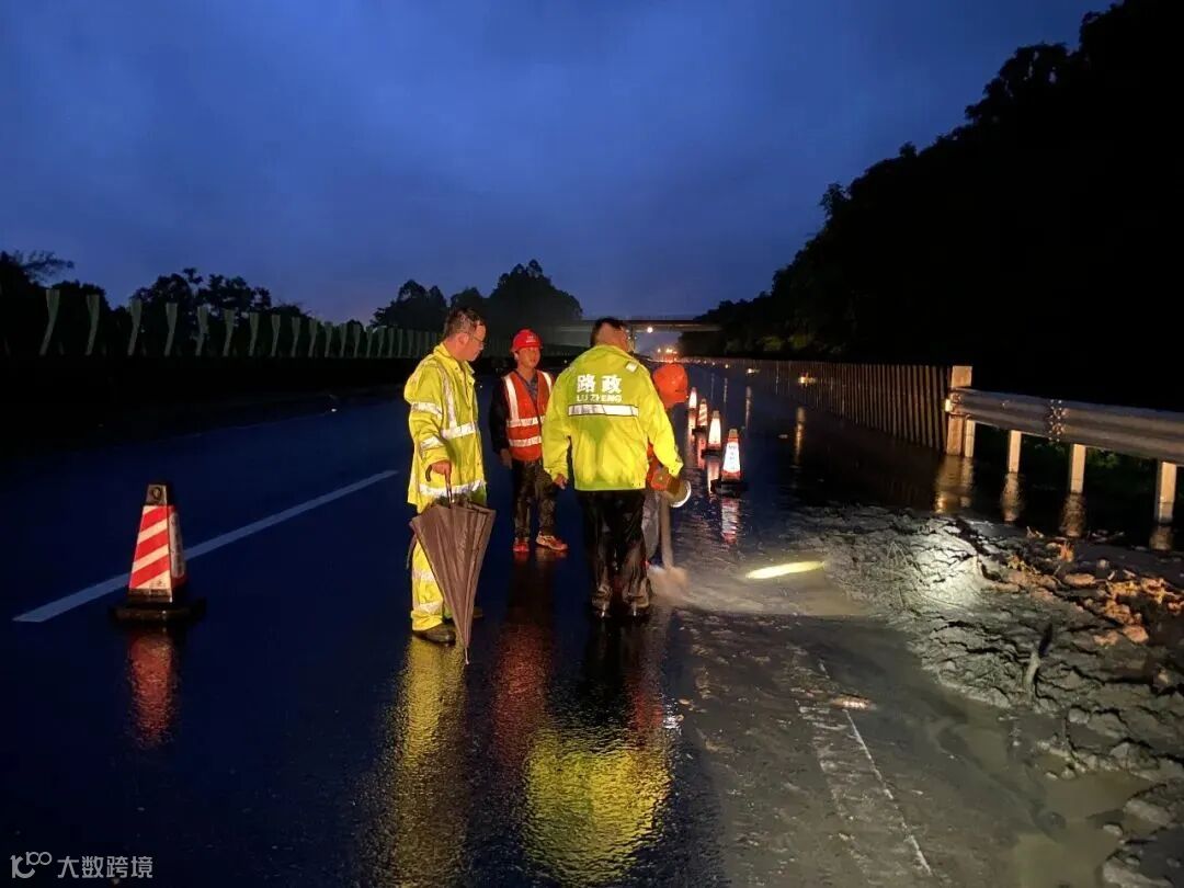 港方向)有黄泥水冲到高速路面,占据主车道和硬路肩,严重影响行车安全。罗阳公司路政、养护人员立即到达现场,封闭主车道和路肩,并与赶来的应急抢险人员合力疏通淤积排水边沟。凌晨5点,主车道清理完毕,现场交通恢复正常通行。