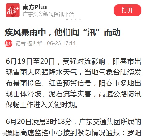 6月19日至20日,受强对流影响,粤西出现雷雨大风强降水天气,阳春市当地气象台陆续发布暴雨橙色、红色预警信号。在防汛保畅工作关键时期,罗阳公司“汛”速行动,启动应急预案,保障了人民群众安全出行。