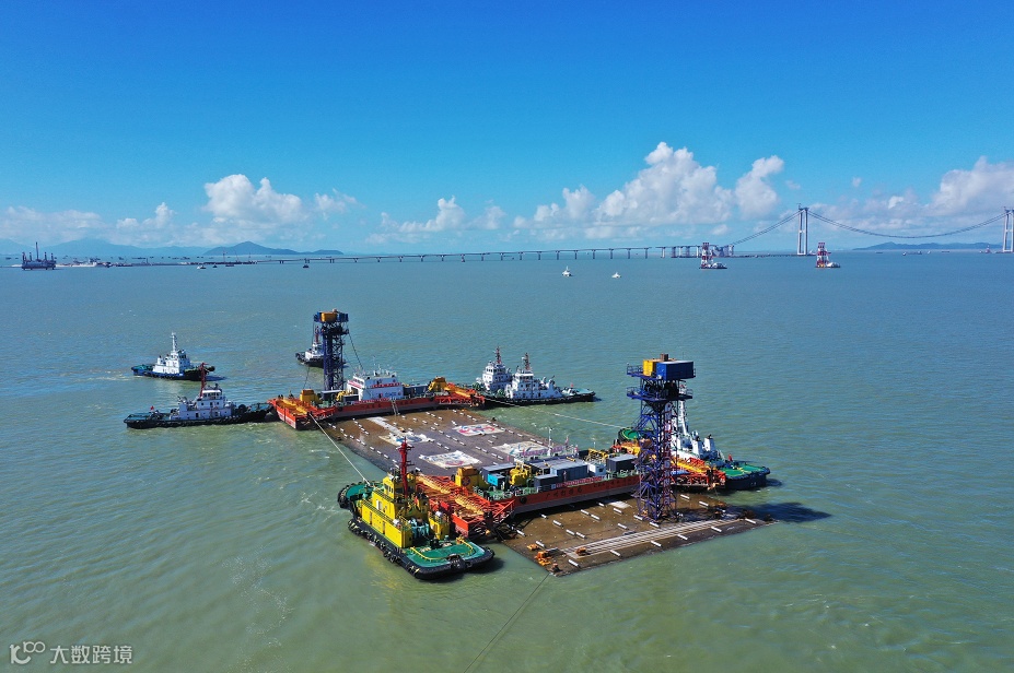 海事局的保驾护航下,跨越珠江口截面交通流量超1000艘次的繁忙航道,于21日12时23分到达施工水域。