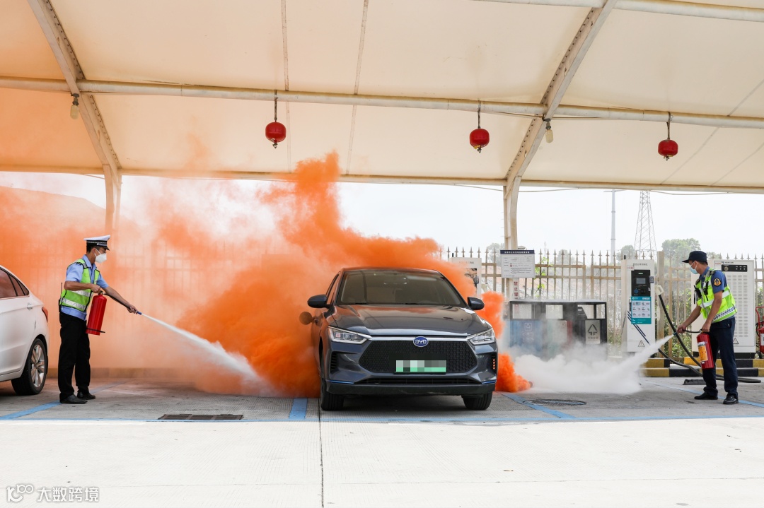 6月15日,在江罗高速新城服务区的新能源汽车充电站内,一场专门针对充电设备起火的消防演练正紧张进行中。