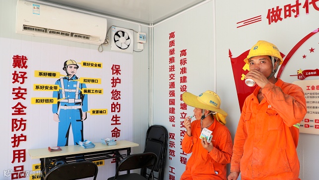 水泥工陈师傅表示:“现在室外温度这么高,我们不时来这里避暑休息。虽然房间不大,但空调、清凉饮料等一应俱全,还是蛮舒服的。”