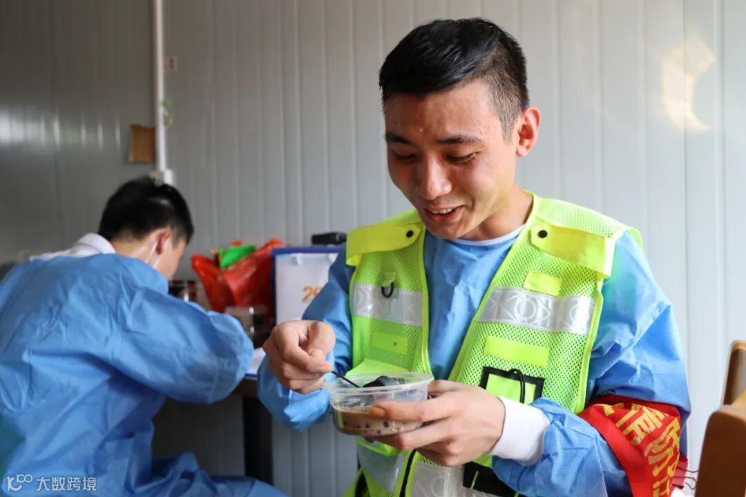 换岗间隙,罗黎明(右一)在休息室喝糖水