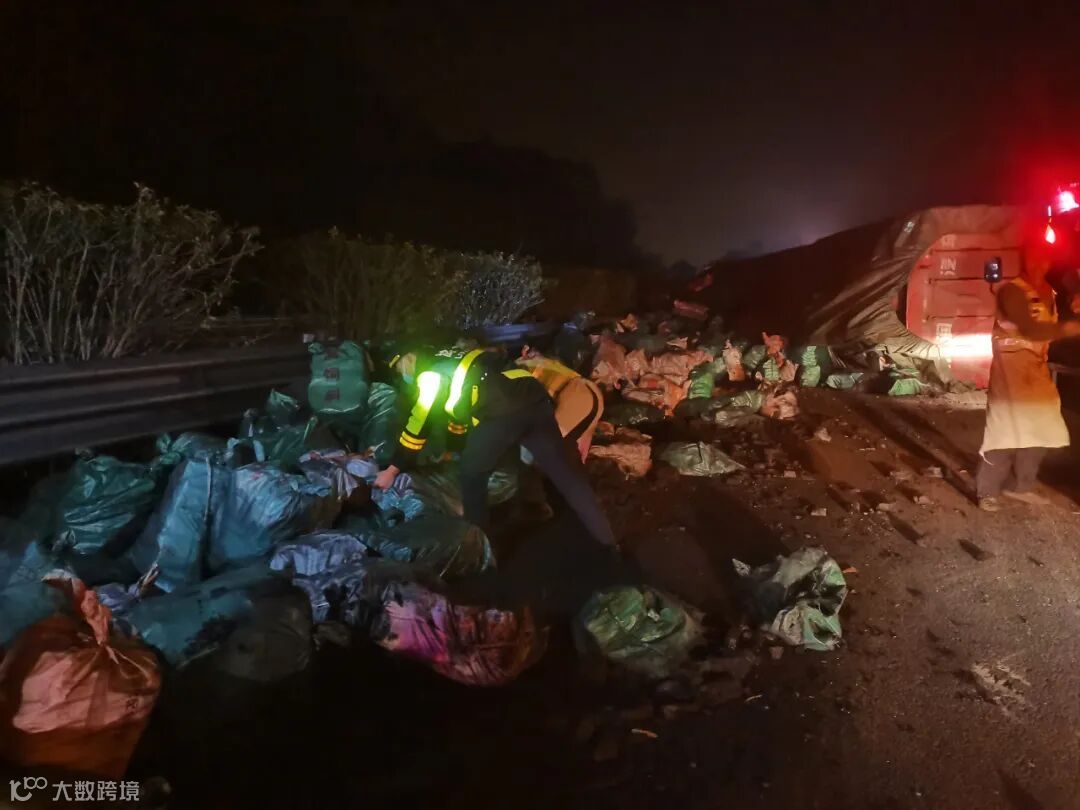 19吨木炭散落路面,罗阳高速路政员深夜清障