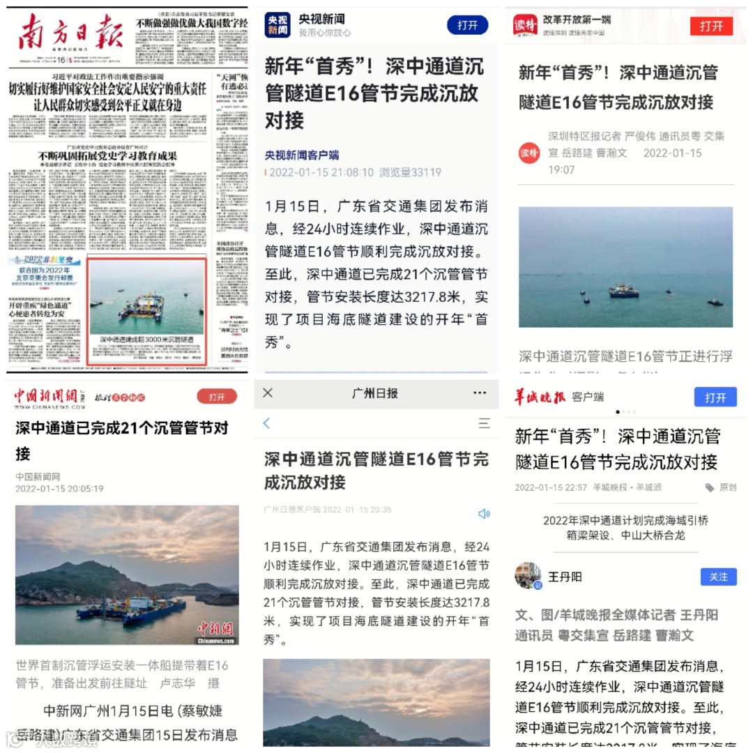 1月15日,经24小时连续作业,深中通道沉管隧道E16管节顺利完成沉放对接。至此,深中通道已完成21个沉管管节对接,管节安装