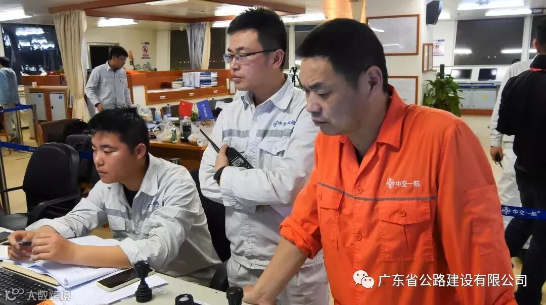 建设团队正在沉管浮运安装一体船上进行沉放作业