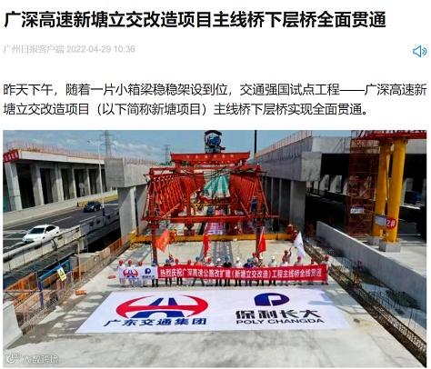 广东省公路建设有限公司4月28日下午,随着一片小箱梁稳稳架设到位,交通强国试点工程——广深高速新塘立交改造项目(以下简称新塘项目)主线桥下层桥实现全面贯通。