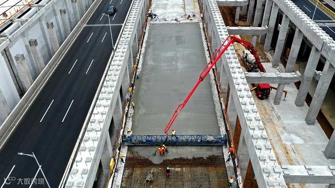 施工人员进行下层桥桥面混凝土浇筑