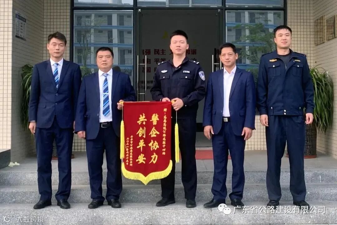广东省公路建设有限公司“感谢贵单位对龙胜派出所工作的大力支持和帮助,期待今后我们双方继续紧密合作,共同维护人民群众合法权益......”12月20日下午,江门市公安局龙胜派出所民警将一面绣着“警企协力,共创平安”的锦旗及一封感谢信,送到了江罗高速龙胜中心站站长刘宝林手中。