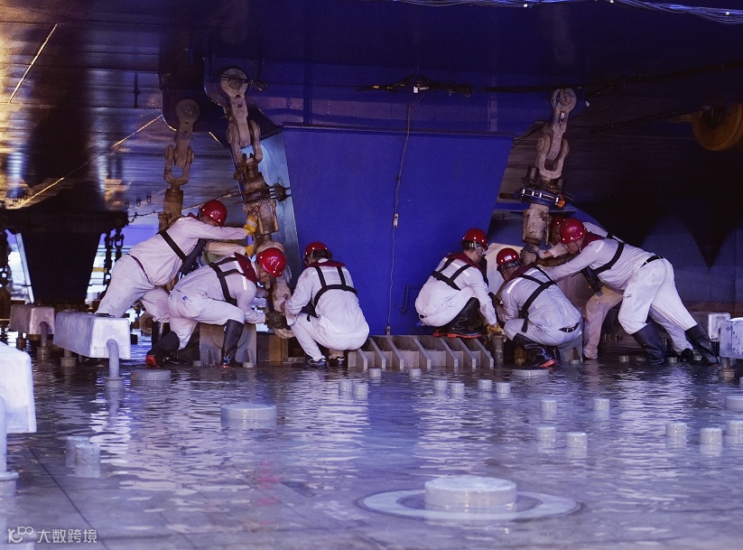 E20管节是首个位于海底基槽与水上航道交汇处的管节,存在“槽-垄-槽”的复杂地形,施工面临地形错综复杂、海流条件较差等难题,管节沉放操作难度增大。施工团队联合国家海洋环境预报中心加强基槽流态分析,严控沉放作业流速条件,为沉管精准对接创造条件。