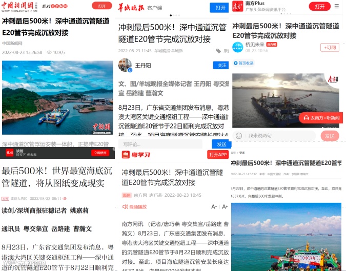 8月22日,深中通道沉管隧道E20管节顺利完成沉放对接。至此,项目海底隧道沉管安装长度达4537.8米,向最后500米发起冲刺。