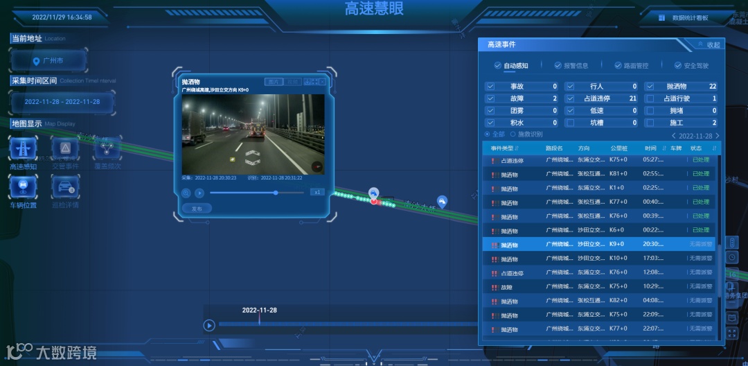 11月28日夜晚20时30分,南环段监控中心“高速慧眼”系统发起警报:“检测到南沙大桥东行K9右侧车道有抛洒物。”随后,路政和养护立即前往处理。第一时间发现这些抛洒物的正是“高速慧眼”系统。
