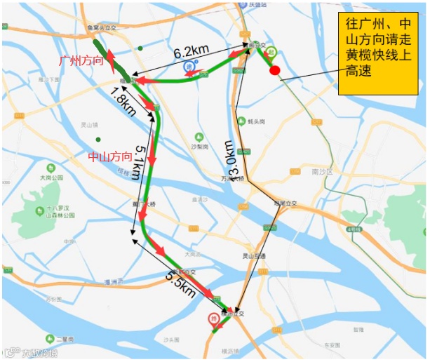 黄阁互通立交位于广州市南沙区,是广澳高速与市南大道、黄榄快速交叉的复合式立交,在推进南沙自贸区的建设中发挥着重要作用。近年来,随着南沙自贸区建设的不断深化及南沙大桥的建成通车,黄阁互通立交车流量增长较大且货车比例较高,尤其在车流高峰期,行经黄阁互通立交的车辆缓慢甚至反堵至主线。