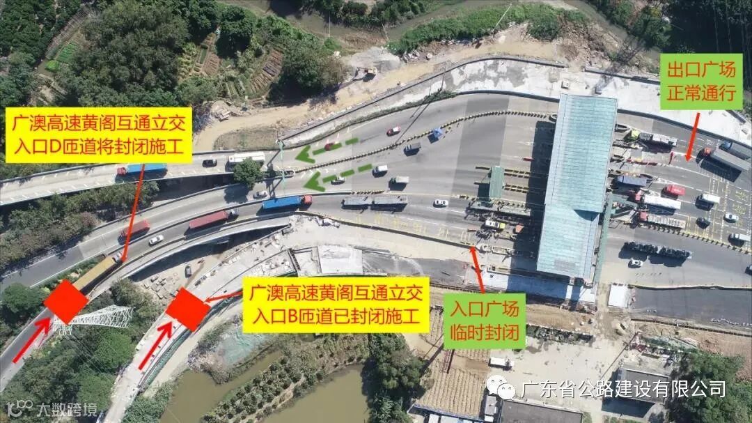 为确保施工顺利进行及交通安全,经有关部门批准,计划自2021年12月18日早上6时起,至2021年12月20日早上6时对广澳高速黄阁互通立交入口D匝道进行全封闭桥梁拼宽施工。如因天气原因无法施工,封闭时间相应顺延。