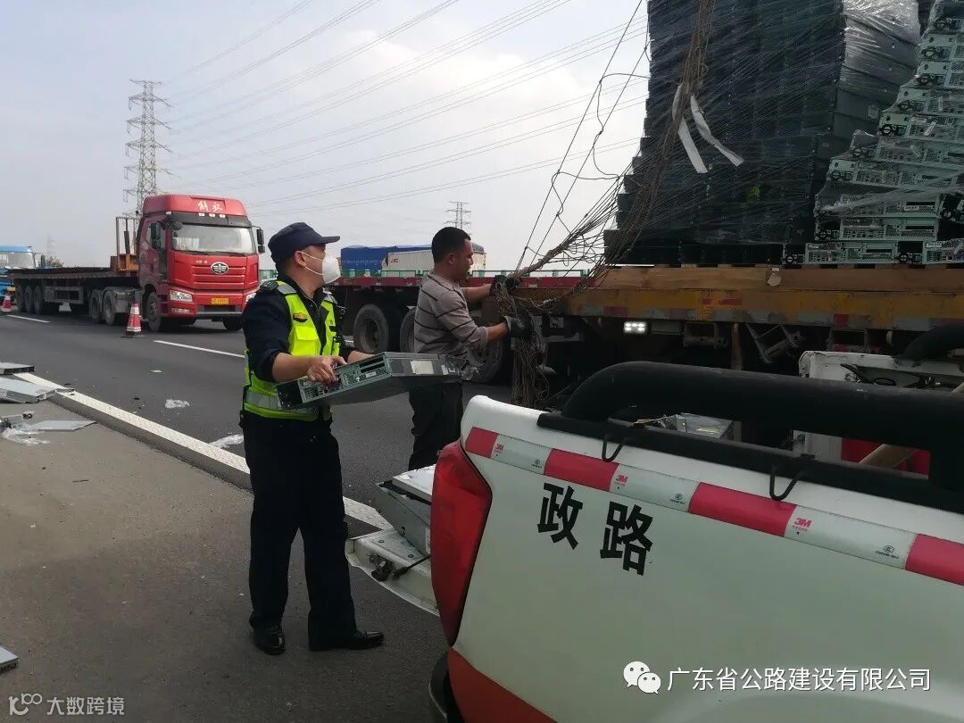 路政员叶中杰、曾鸿彬赶到现场,发现路面上散落着几十台电脑主机,司机正慌忙地把主机搬至路肩;货车上的剩余设备出现大面积倾斜,有继续掉落的危险。路政员立即分工协作,叶中杰做好现场安全围蔽并引导过往车辆有序通行;曾鸿彬上前向司机了解情况。