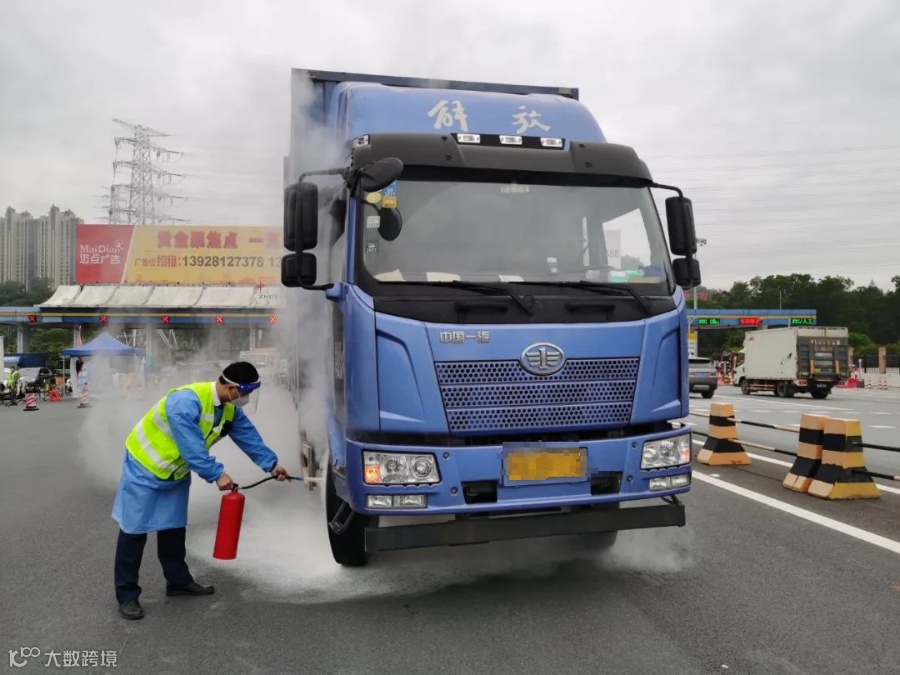 城区站出口突发着火,轮胎冒出滚滚浓烟。此时,该货车正准备驶离