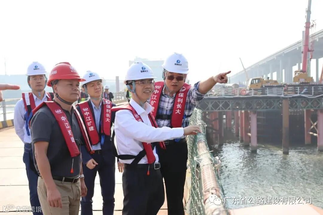 苏志东一行来到中江高速改扩建项目S4标西江特大桥施工现场,详细了解改扩建工程进展情况,查看施工现场安全生产管理,以及新建西江特大桥施工过程中对旧桥主墩防撞施工部署、航道安全通航保障等工作。