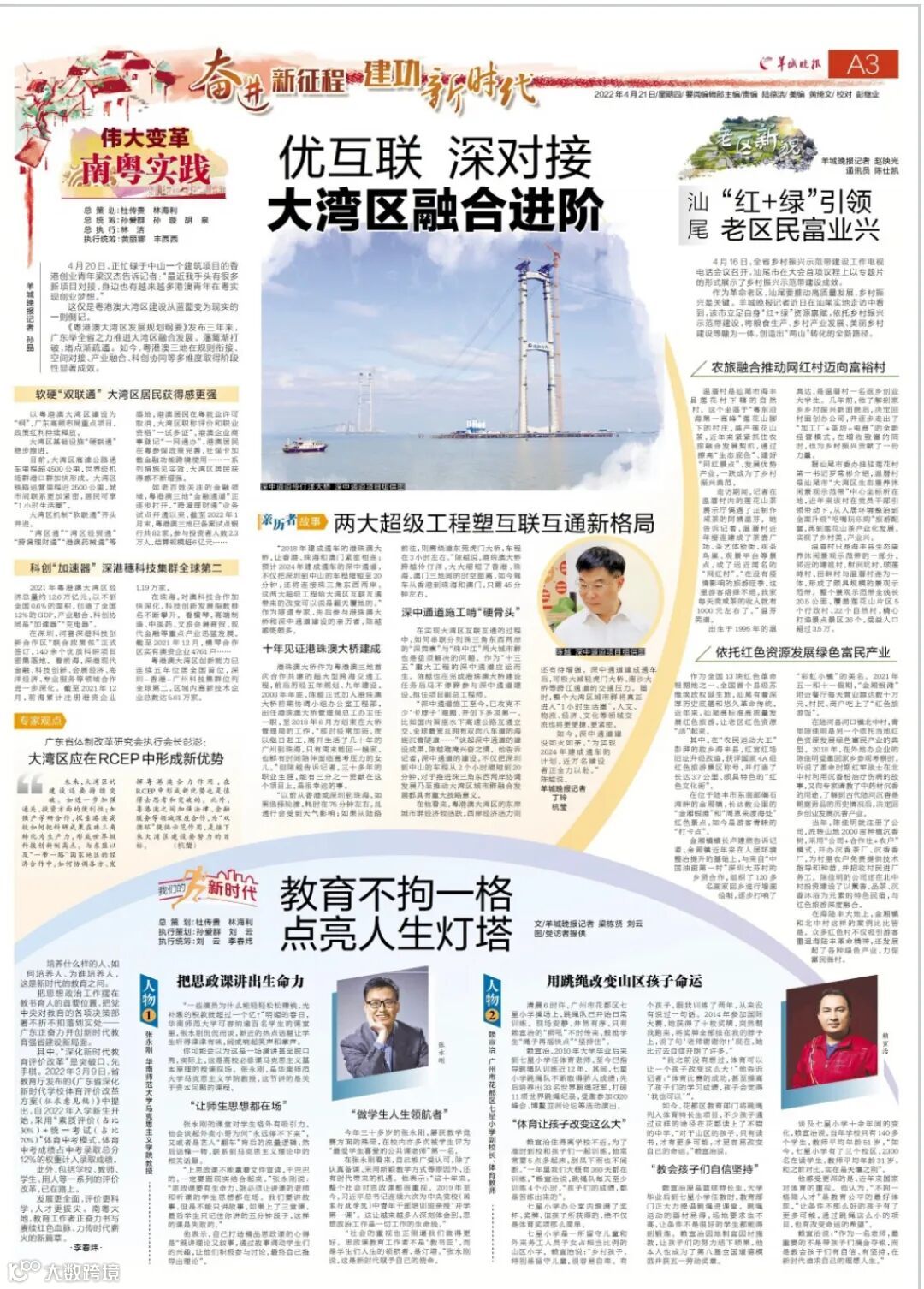 近日,羊城晚报推出“伟大变革,南粤实践”专题报道,聚焦《粤港澳大湾区发展规划纲要》发布三年来,广东举全省之力推进大湾区融合发展。其中,著名隧道专家、深中通道管理中心副总工程师陈越接受专访,以参建大湾区基础设施“硬联通”的亲历者视角,讲述了建设大湾区互联互通新格局的故事。
