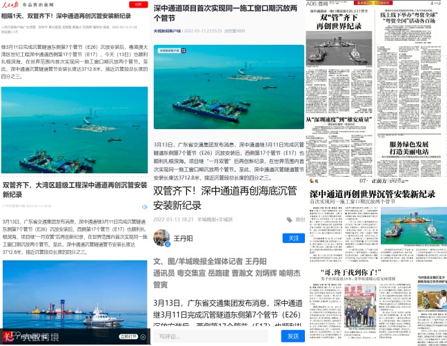 自2021年8月以来,深中通道项目沉管隧道安装东西两侧齐头并进,连续半年实现每月安装2节大型沉管的工效,在世界沉管隧道安装史上是第一次。作为项目关键控制性工程之一,沉管隧道高质量、高效率建成,将有力保障深中通道项目如期建成通车、早日发挥粤港澳大湾区核心交通枢纽作用。