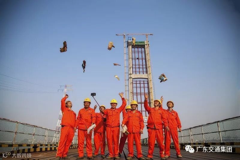 资料图:南沙大桥桥塔封顶,建设者在现场欢呼雀跃