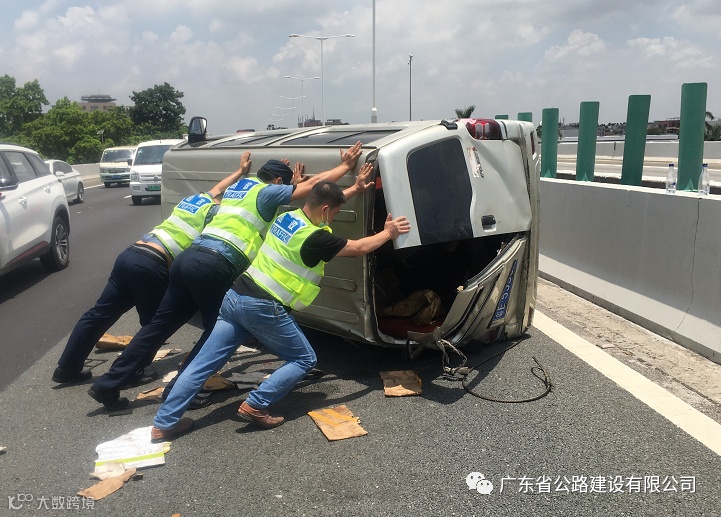 6月16日22时16分,广珠段监控中心接属地交警通知,广澳高速北行K43+500处有一辆货车侧翻。广珠段路政员林振挺、叶锦波迅速到达现场。此时,货车司机已自行从车内爬出,车上运载的一吨陶瓷制品散落在路面上。