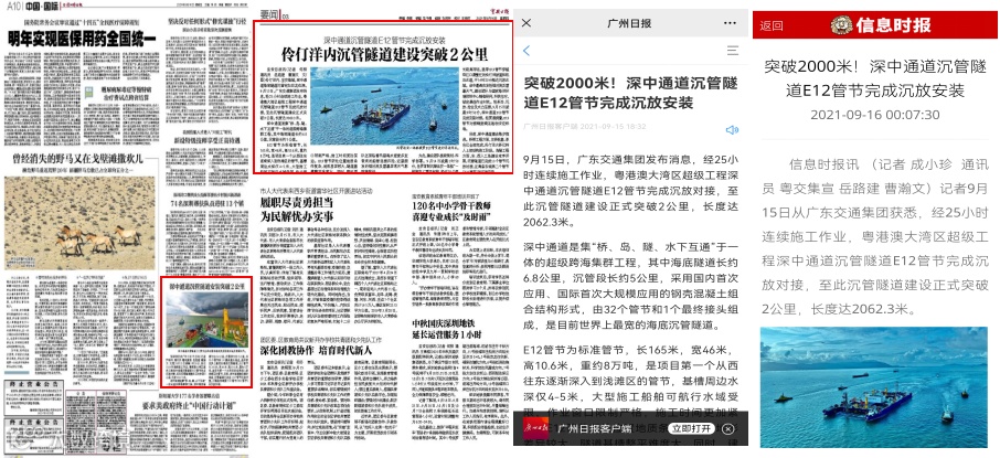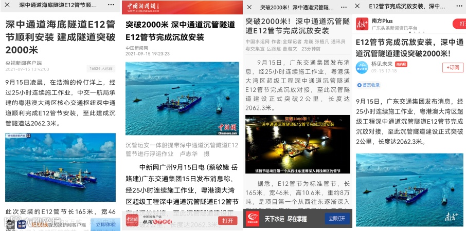 9月15日,经25小时连续施工作业,粤港澳大湾区超级工程深中通道沉管隧道E12管节完成沉放对接,至此沉管隧道建设正式突破2公里,