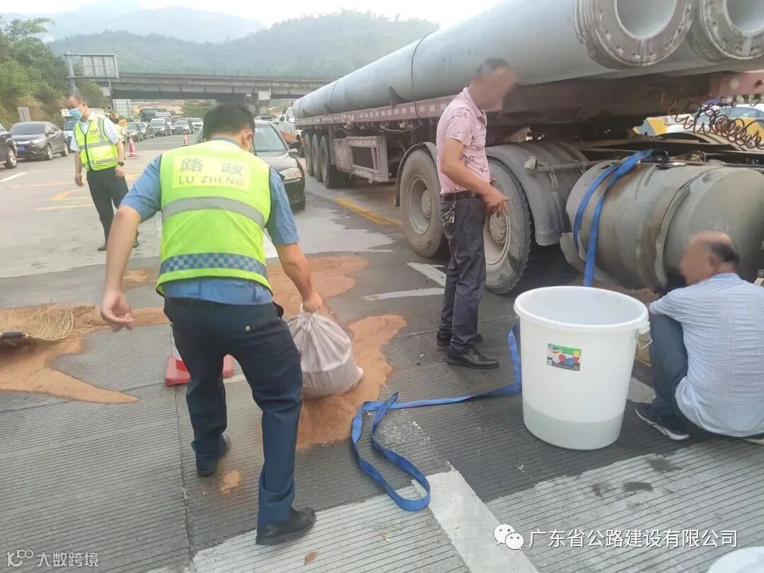 看着柴油从油箱不断流出,货车司机十分焦急,“有没有什么办法帮帮我,这油都是血汗钱啊!再漏下去,我这一趟就白跑了!”现场工作人员拿来抹布堵住破损处,减缓渗漏。17时28分,路政、养护、交警人员陆续到场。众人分工合作,交警快速疏导后方车流,收费员拿来塑料桶盛装泄漏柴油,路政与养护人员清理地面。